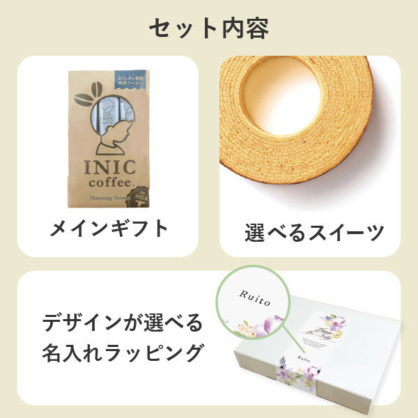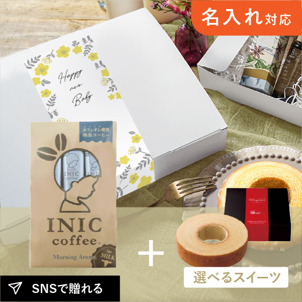 名入れができるラッピングボックスで贈るお礼ギフト。INIC coffee(イニックコーヒー)と人気スイーツを詰め合わせました。コーヒー好きの方に喜ばれるギフトセットです。生まれたお子様の名前を添えて、赤ちゃんの「初めまして」のご挨拶にぴったりです。