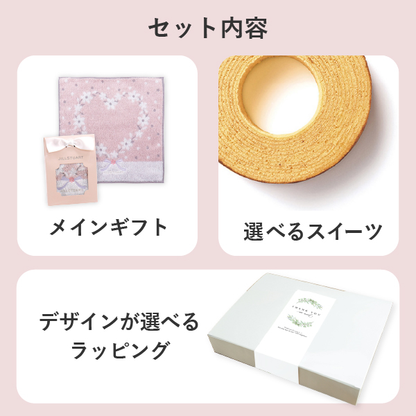 可愛らしいギフトボックスにJILLSTUART(ジルスチュアート)のタオルハンカチと人気スイーツを詰め合わせました。ちょっとしたお礼ギフトや内祝いにおすすめのセットです。