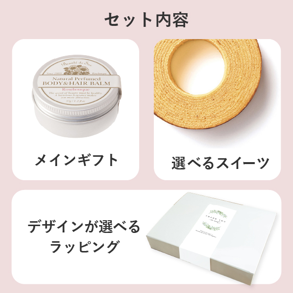可愛らしいギフトボックスにボーテ・デュ・サエのボディ&ヘアバームと人気スイーツを詰め合わせました。ちょっとしたお礼ギフトや内祝いにおすすめのセットです。