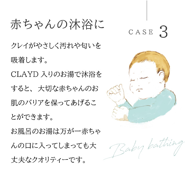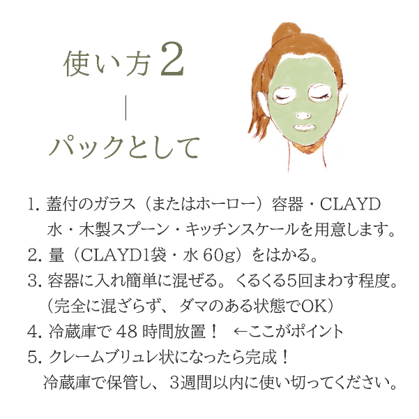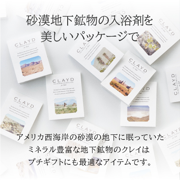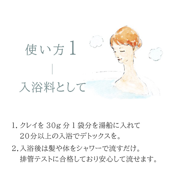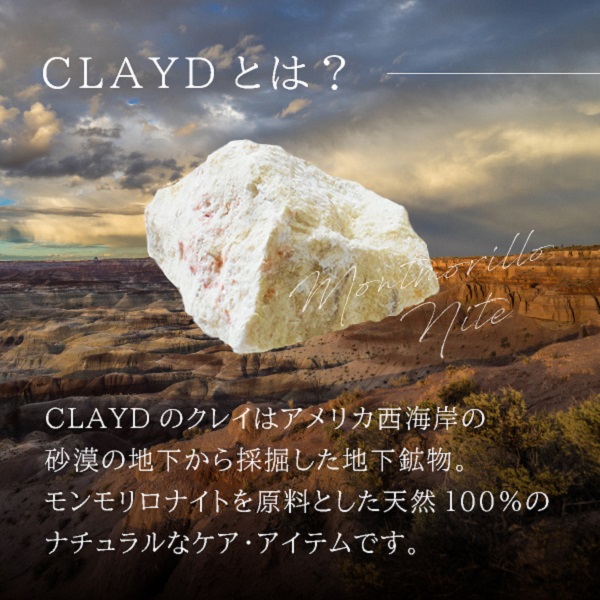 | ・治療や美容のため体内にペースメーカーや金属、プロテーゼやシリコンなどが入っている場合ならびにボトックスなどを注入されている場合は医師とご相談のうえご使用ください。 ・皮膚あるいは体質に異常がある時は使用しないでください。 ・使用中や使用後、皮膚に発疹、発赤、かゆみ、刺激感等の異常が現れた場合、使用を中止し医師にご相談ください。 ・極端に体力が落ちている方や 体調不良の方は医師とご相談のうえご使用ください。 ・CLAYDが目に入った場合は、こすらず直ちに水またはぬるま湯で充分に洗い流してください。 ・CLAYDを飲用しても害はありませんが、万一大量に飲み込んだ場合は水を飲ませる等の処置を行った後、医師にご相談ください。 ・CLAYDは空気中に舞いやすいため吸い込まないようにしてください。 ・ステンレス素材・木材の浴槽に使用した場合、変質・変色する場合があります。 ・長時間CLAYDと金属が接触すると変質する可能性があるため、追い炊き・循環機能を停止して使用してください。 ・CLAYDと金属が接触した部分はCLAYDが残らないように使用後よくすすいでください。 ・小さなお子様の手の届かないところに保管してください。 ・開封後のCLAYDの保管は、金属を避け、吸湿しないようガラスかホーローの容器で密封して保管してください。 ・繊維にCLAYDが付着すると色がつく場合があるので衣服等に付かないようご注意ください。 ・残り湯は洗濯に使用しないでください。 ・砂漠の地下から採掘された100%天然素材のクレイのため稀ににクレイ層の素材が凝固した状態のものが含有されることがありますが、成分はクレイそのものですのでご安心ください。よく溶かしてからご入浴いただくか、気になる場合は取り除いてからご使用ください。 |