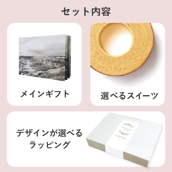 このギフトセットは、人気アイテムと選べるスイーツがセットになっています。可愛らしい専用ボックスはおしゃれなデザインが特徴です。ちょっとしたお礼やお返しにおすすめしたい商品です。