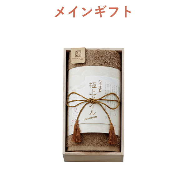 メインギフトは「今治謹製極上タオル 木箱入りフェイスタオル(グリーン)」です。シックで大人な色合いと高品質のコットンを使用し、繊細な繊維1本1本で上質な肌ざわりを生み出した「極上タオル」。高級感のある木箱に入れてお届けするので、大切な方への特別な贈り物に最適です。