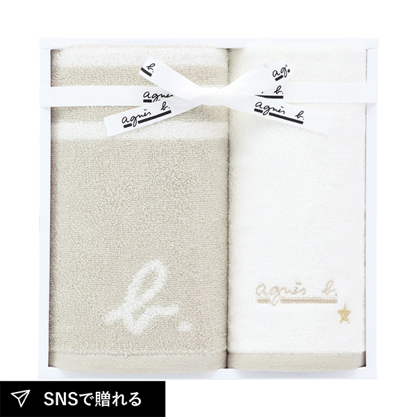 柔らかなベージュカラーのフェイスタオル1枚とゲストタオル1枚のセット。アニエスベーのシンプルで上品なデザインが日常のバスタイムを彩り、贈り物としても喜ばれる、使い勝手と上質さを兼ね備えたタオルセットです。