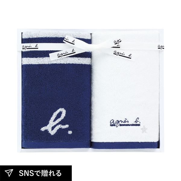 落ち着いたダークブルーのフェイスタオル2枚セット。アニエスベーのボーダーとロゴ刺繍が洗練された印象を与え、毎日のバスタイムを上品に彩ります。日常使いはもちろん、ギフトとしても喜ばれる、品質とデザインを兼ね備えたタオルセットです。