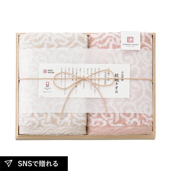 日本の伝統的な模様である唐草模様と来島海峡の荒波をイメージした波模様から着想を得た、手描きの不規則な曲線を美しく表現したタオルギフト。厳選された2種類のパイル糸を使い、ふっくらとやわらかいタオルになっています。品格を感じる木箱に入ったギフトです。