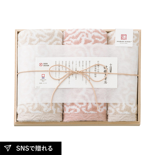 日本の伝統的な模様である唐草模様と来島海峡の荒波をイメージした波模様から着想を得た、手描きの不規則な曲線を美しく表現したタオルギフト。厳選された2種類のパイル糸を使い、ふっくらとやわらかいタオルになっています。品格を感じる木箱に入ったギフトです。