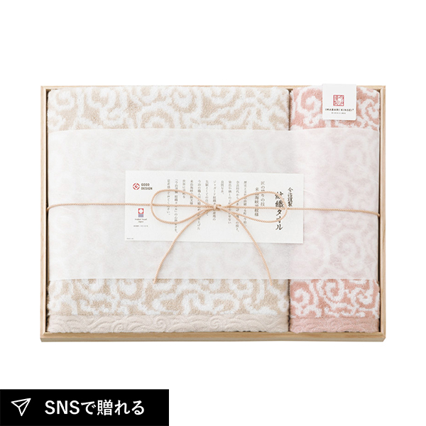 日本の伝統的な模様である唐草模様と来島海峡の荒波をイメージした波模様から着想を得た、手描きの不規則な曲線を美しく表現したタオルギフト。厳選された2種類のパイル糸を使い、ふっくらとやわらかいタオルになっています。品格を感じる木箱に入ったギフトです。