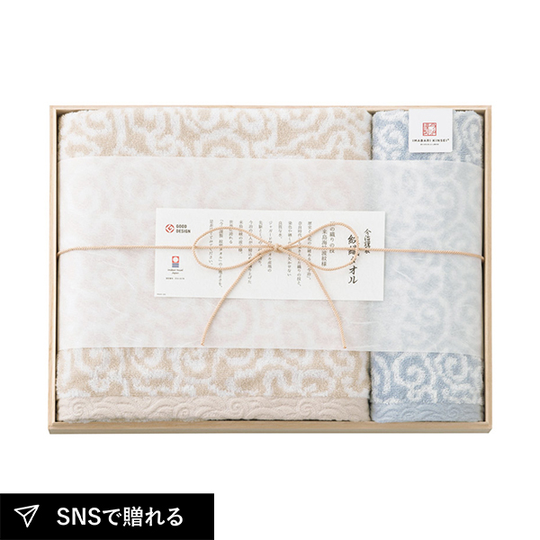 日本の伝統的な模様である唐草模様と来島海峡の荒波をイメージした波模様から着想を得た、手描きの不規則な曲線を美しく表現したタオルギフト。厳選された2種類のパイル糸を使い、ふっくらとやわらかいタオルになっています。品格を感じる木箱に入ったギフトです。