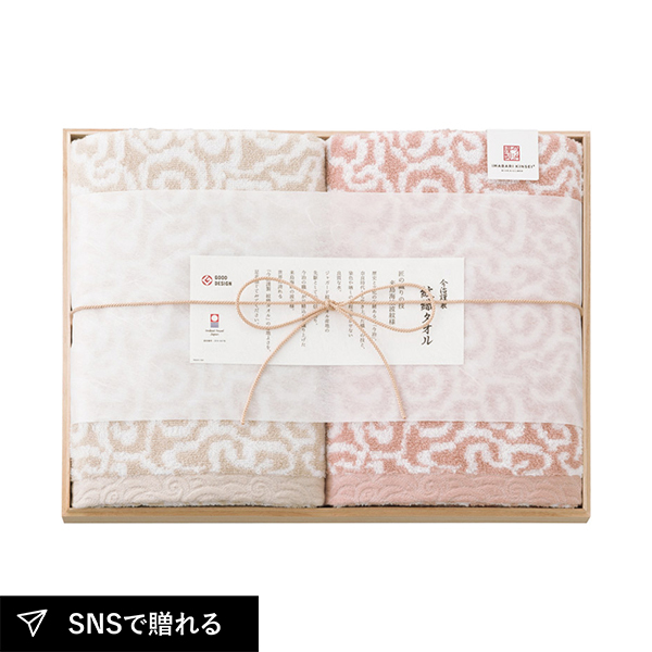 日本の伝統的な模様である唐草模様と来島海峡の荒波をイメージした波模様から着想を得た、手描きの不規則な曲線を美しく表現したタオルギフト。厳選された2種類のパイル糸を使い、ふっくらとやわらかいタオルになっています。品格を感じる木箱に入ったギフトです。
