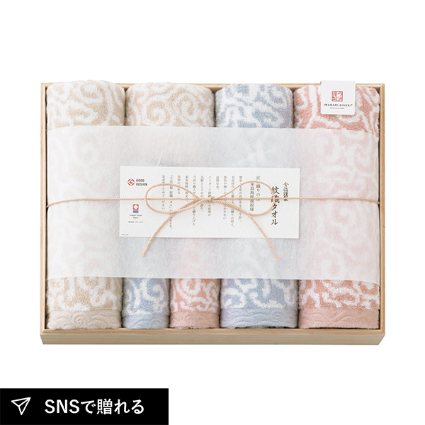 日本の伝統的な模様である唐草模様と来島海峡の荒波をイメージした波模様から着想を得た、手描きの不規則な曲線を美しく表現したタオルギフト。厳選された2種類のパイル糸を使い、ふっくらとやわらかいタオルになっています。品格を感じる木箱に入ったギフトです。