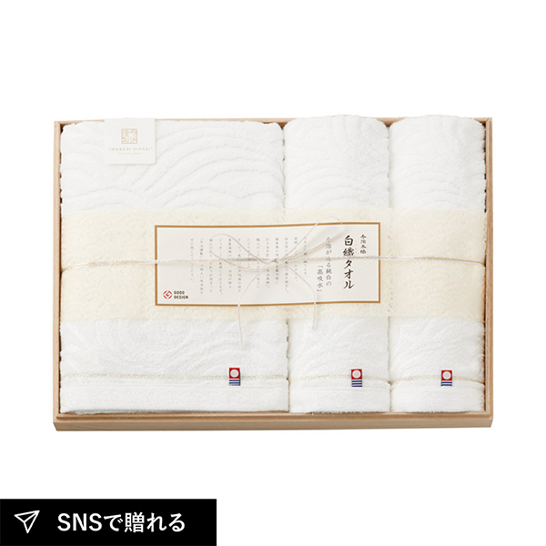 高吸水と白さ際立つ細部へのこだわりを追求した「今治本晒」。今治の自然の美からとったデザインを高い技術で表現しました。品のある木箱入りギフトなので、目上の方や大切な方へのプレゼントにもおすすめです。