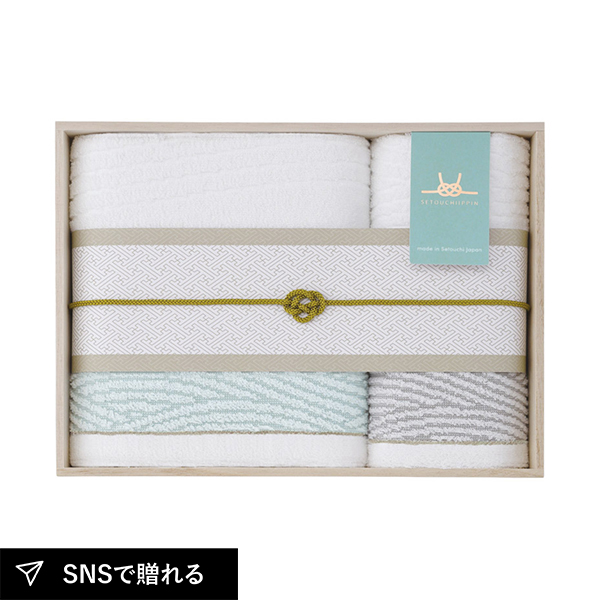 愛媛県今治産「瀬戸内逸品」のバスタオルとフェイスタオルのセット。瀬戸内海をイメージした上品なデザインを木箱に収め、贈る方に高級感と心地よい肌触りを届けます。日常使いにも特別なギフトとしても喜ばれる一品です。