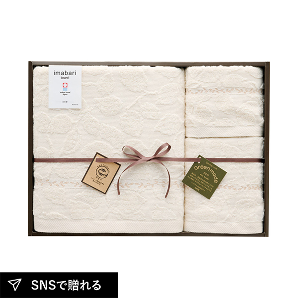 人に優しく環境に優しいグリーンモードエコタオル。無漂白・無染色の綿で織り上げた風合いの良さと天然にこだわったタオルギフトです。ボーダー部分にカラードコットンでリーフ柄を表現しました。