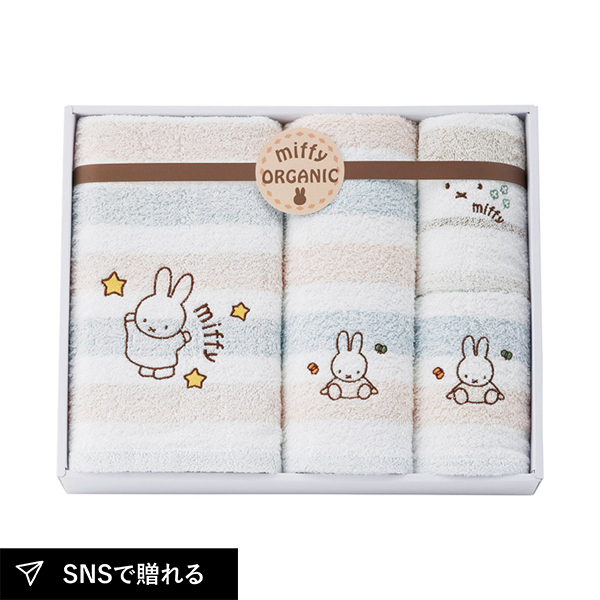 パイル糸にインドで栽培したオーガニックコットンを使用した環境にも優しいタオルです。ミッフィー のかわいいシルエットとナチュラルなボーダー柄のタオルギフトシリーズは、子どもから大人まで幅広く使っていただけます。