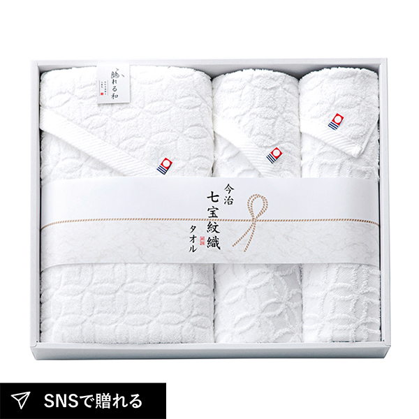 日本古来の縁起柄「七宝」をモチーフに、今治自慢の紋織技術で織り上げたタオルセット。伝統文様が美しく映え、ふんわりとした肌ざわりで日常使いから贈り物まで幅広く活躍します。
