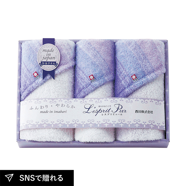 L'esprit Pur(レスプリピュール)とはフランス語で「きよらかなこころ」を意味します。純真な想いからくる、清らかなこころのイメージを清楚なパープルグラデーションを使ってふんわりとやわらかなタオルギフトにしました。