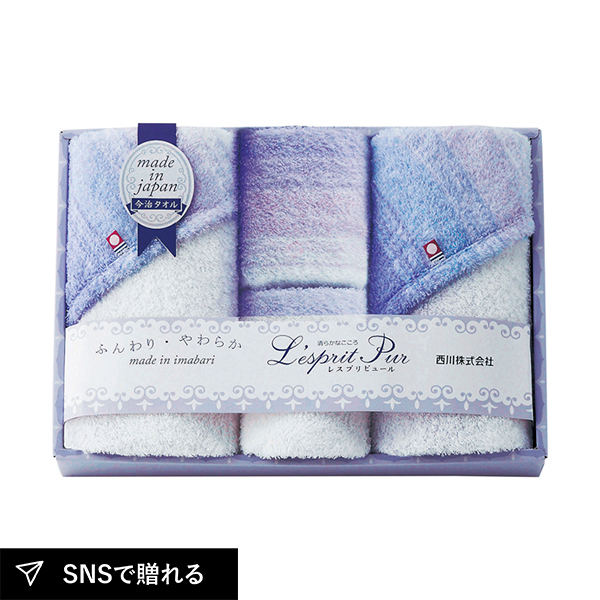 L'esprit Pur(レスプリピュール)とはフランス語で「きよらかなこころ」を意味します。純真な想いからくる、清らかなこころのイメージを清楚なパープルグラデーションを使ってふんわりとやわらかなタオルギフトにしました。