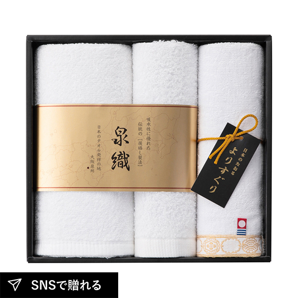日本を代表するタオル産地の魅力を楽しめるタオルセット。やわらかく吸水性に優れた甘撚り糸の泉州タオルと、心地よい純白の今治タオルを組み合わせました。使い比べも楽しめる、贈り物に最適な上質ギフトです。