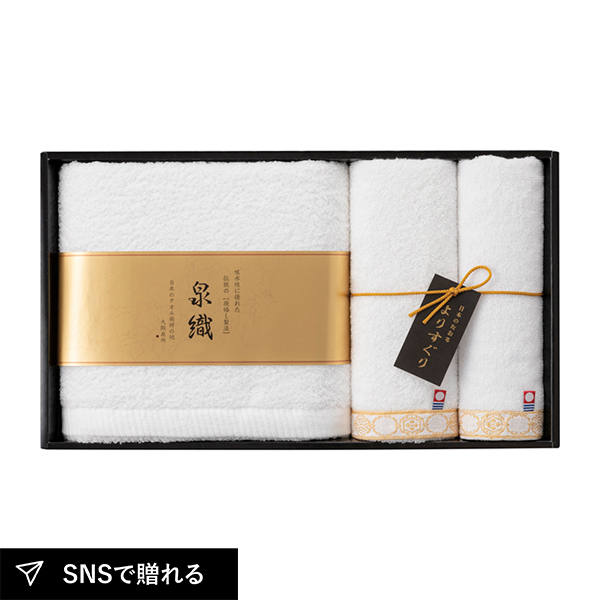 日本を代表するタオル産地の魅力を楽しめるタオルセット。やわらかく吸水性に優れた甘撚り糸の泉州タオルと、心地よい純白の今治タオルを組み合わせました。使い比べも楽しめる、贈り物に最適な上質ギフトです。