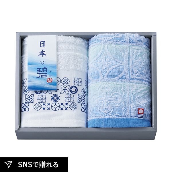 日本の自然を感じさせる美しいブルーが印象的なタオルセット。今治と泉州、二大産地それぞれの特長を生かし、使い心地の違いを楽しめます。海や川を思わせる碧の彩りが、上質で爽やかな贈り物に最適です。