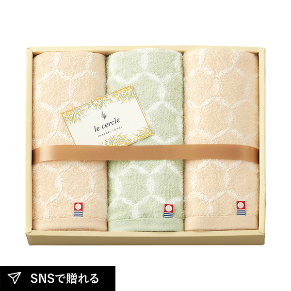 セルクルは、フランス語で「円」を意味します。人とのつながり”縁”と「円」をかけ合わせ、繋がりながら広がってゆく様を今治産地の特徴でもあるジャカード織で表現しました。落ち着いたグリーンとあたたかみのあるベージュの色の組み合わせはどなたにも喜んでいただけます。