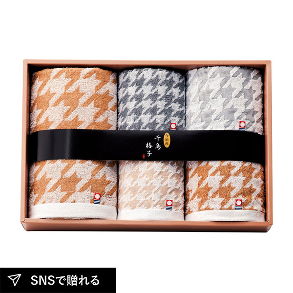 英国発の千鳥格子をモチーフにした今治のタオルセット。チャコールグレーとキャメルで仕上げたモダンデザインが魅力。滑らかな肌触りで日常を彩り、上質でお洒落な贈り物としても最適です。