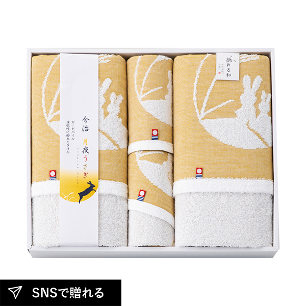 月夜に浮かぶ「うさぎ」をガーゼ織ジャガードで表現した今治タオルセット。吸水・速乾性に優れ、やさしい肌触りで毎日使いやすく、感謝の気持ちを込めた贈り物に最適です。