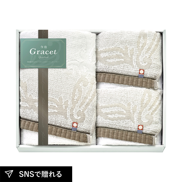 高級感のあるグレーとあたたかみのあるベージュを混ぜ合わせた、グレージュカラーのタオルセット。甘撚りの糸で織り上げ、ふんわりとした肌触りです。長い歴史の中で培われた今治のジャガード織で、ゆったりとしたオーナメント柄を繊細な曲線美で表現。優しいグラデーションにも、糸染めの業が光ります。