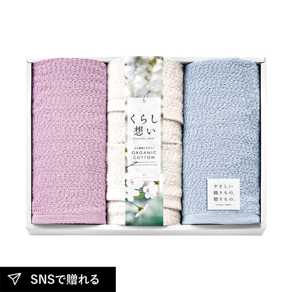 大阪泉州で織り上げた「くらし想い オーガニックコットン」タオルセット。スリムで干しやすく、収納や洗濯も便利。コンパクトでも肌触りは抜群で、日常にやさしさを添える使いやすいタオルギフトです。
