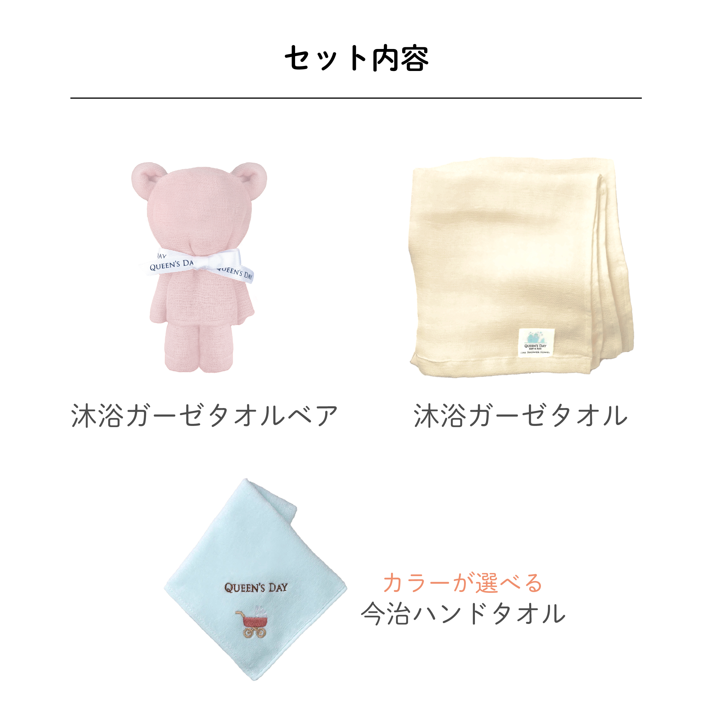 | 沐浴ガーゼタオル×1 沐浴ガーゼタオルベア×1 ハンドタオル×1 オリジナルボックス×1 |