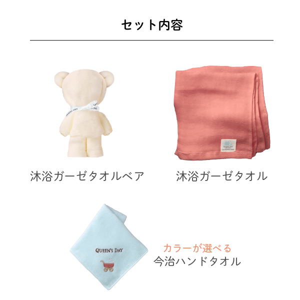 | 沐浴ガーゼタオル×1 沐浴ガーゼタオルベア×1 ハンドタオル×1 オリジナルボックス×1 |