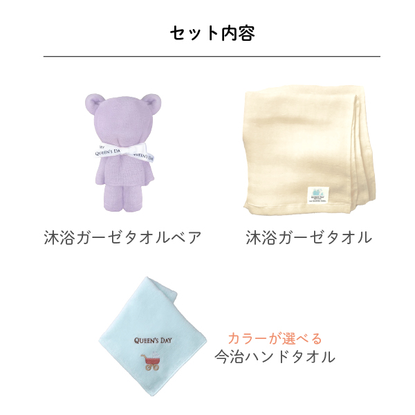 | 沐浴ガーゼタオル×1 沐浴ガーゼタオルベア×1 ハンドタオル×1 オリジナルボックス×1 |
