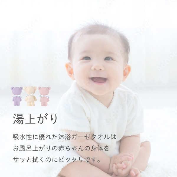 驚くほどの柔らかさと、保湿性、吸水性に優れた赤ちゃんのお肌を優しく洗うのにぴったりな沐浴ガーゼは育児の必須アイテム!1度の沐浴に使用するガーゼタオルは平均2?3枚程と言われており、何枚あっても喜ばれます。赤ちゃんはまだお湯に浸かることができないので、体が冷えてしまわないように沐浴ガーゼをかけたりして体温を調節したりします。デリケートなお肌を傷つけないように、沐浴専用のガーゼはとってもおすすめです。もちろん、お風呂だけではなく汗を拭いたり、よだれを拭いたりする時にもとっても便利。クマの形をしたタオルは使うのがもったいないくらいキュートで、ママのテンションもあがるとっても可愛い贈り物です。