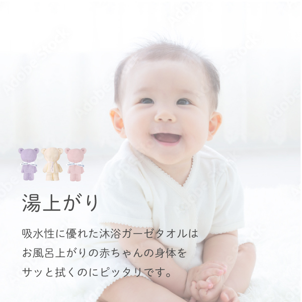 驚くほどの柔らかさと、保湿性、吸水性に優れた赤ちゃんのお肌を優しく洗うのにぴったりな沐浴ガーゼは育児の必須アイテム!1度の沐浴に使用するガーゼタオルは平均2?3枚程と言われており、何枚あっても喜ばれます。赤ちゃんはまだお湯に浸かることができないので、体が冷えてしまわないように沐浴ガーゼをかけたりして体温を調節したりします。デリケートなお肌を傷つけないように、沐浴専用のガーゼはとってもおすすめです。もちろん、お風呂だけではなく汗を拭いたり、よだれを拭いたりする時にもとっても便利。クマの形をしたタオルは使うのがもったいないくらいキュートで、ママのテンションもあがるとっても可愛い贈り物です。