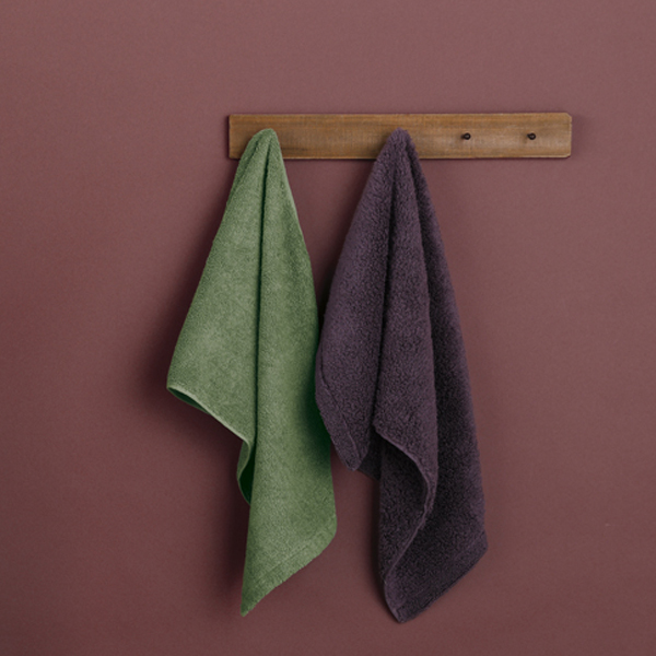 アメジストパープルのタオル(今治)は糸に撚りがなく、綿そのもののようなふわふわの肌触りが特徴の、無撚糸(むねんし)を使用しています。一般的なタオルに使われる20番手の糸よりも細い、30番手の無撚糸で織り上げているので、より繊細な柔らかさを感じていただけます。エメラルドグリーンのタオル(泉州)は、40番手という一般的なタオルの半分の細さの糸を緩くねじった「甘撚り(あまより)」にしたものを、2本使って仕上げました。耐久性と使い心地を兼ね備えた中厚手タイプです。