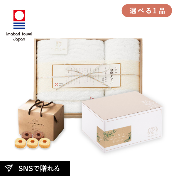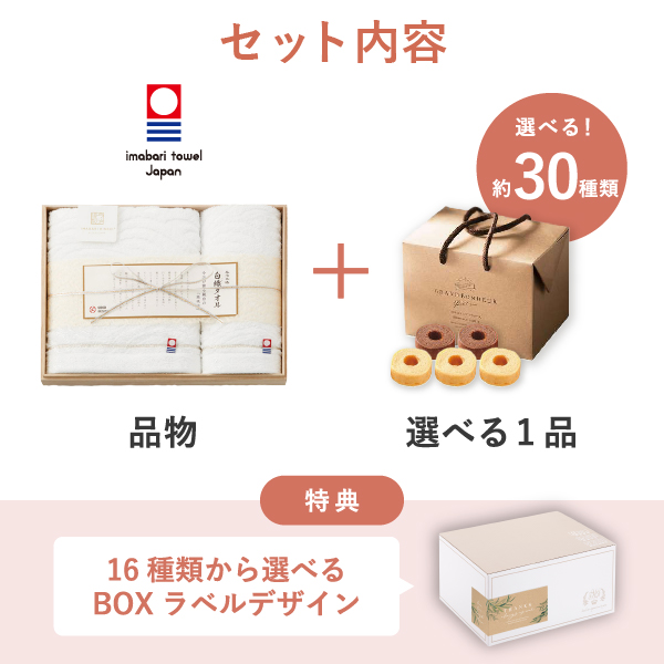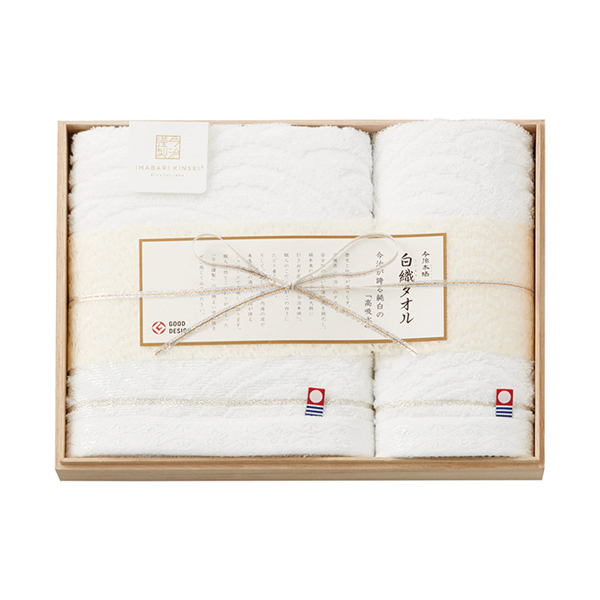 メインギフトは「今治謹製 白織タオル 木箱入りフェイスタオル1P・ウォッシュタオル1P」です。