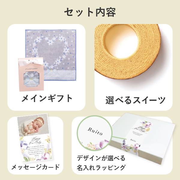 お名前を入れられる専用ボックスシールがおしゃれ!人気ギフトと選べるスイーツ、オリジナルのメッセージカードがセットになった出産内祝いにぴったりのギフトです。