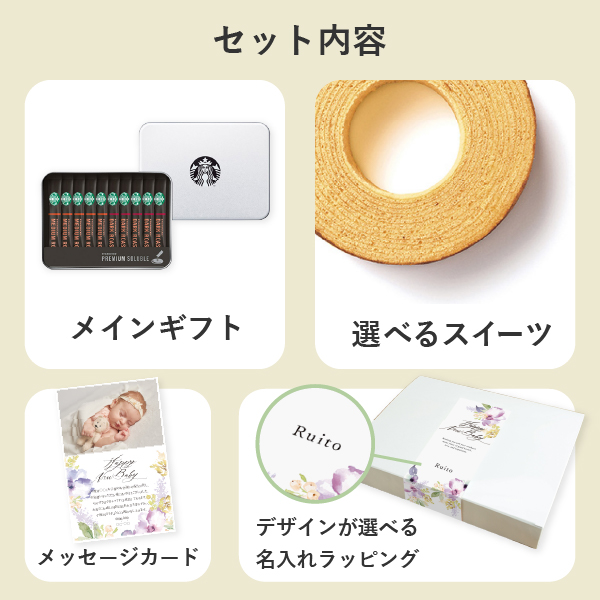 お名前を入れられる専用ボックスシールがおしゃれ!人気ギフトと選べるスイーツ、オリジナルのメッセージカードがセットになった出産内祝いにぴったりのギフトです。