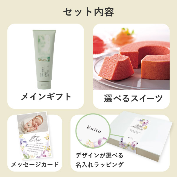 お名前を入れられる専用ボックスシールがおしゃれ!出産内祝いギフトにぴったりなギフトセット。人気のスキンケアアイテムをはじめとする人気ギフトと選べるスイーツ、そしてオリジナルのメッセージカードをセットにしたギフトです。
