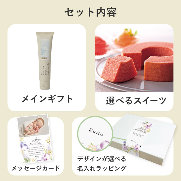 お名前を入れられる専用ボックスシールがおしゃれ!出産内祝いギフトにぴったりなギフトセット。人気のスキンケアアイテムをはじめとする人気ギフトと選べるスイーツ、そしてオリジナルのメッセージカードをセットにしたギフトです。
