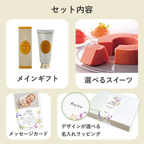お名前を入れられる専用ボックスシールがおしゃれ!出産内祝いギフトにぴったりなギフトセット。人気のスキンケアアイテムをはじめとする人気ギフトと選べるスイーツ、そしてオリジナルのメッセージカードをセットにしたギフトです。