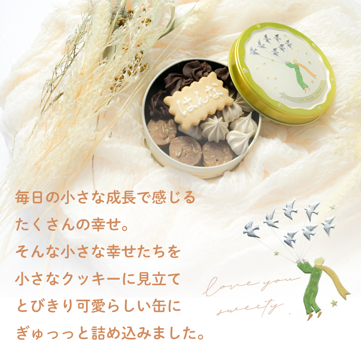 お子さまとのきらめく小さな幸せを小さなクッキーに見立て、とびきり可愛らしい缶にぎゅっと詰め込みました。出産内祝いにぴったりなスイーツギフトです。