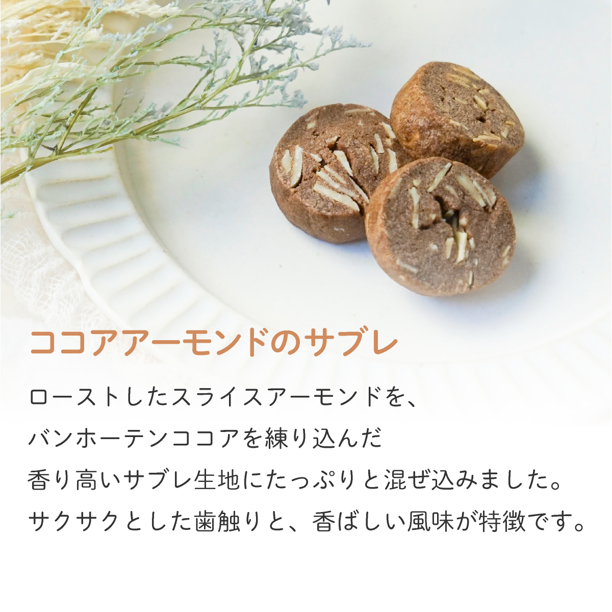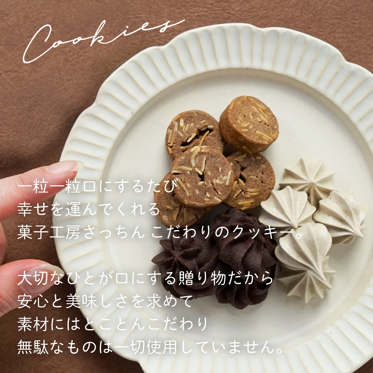 一粒一粒口にするたび幸せを運んでくれる菓子工房さっちんこだわりのクッキー。大切な人が口にするものだから素材にこだわり、無駄なものは一切使用していません。