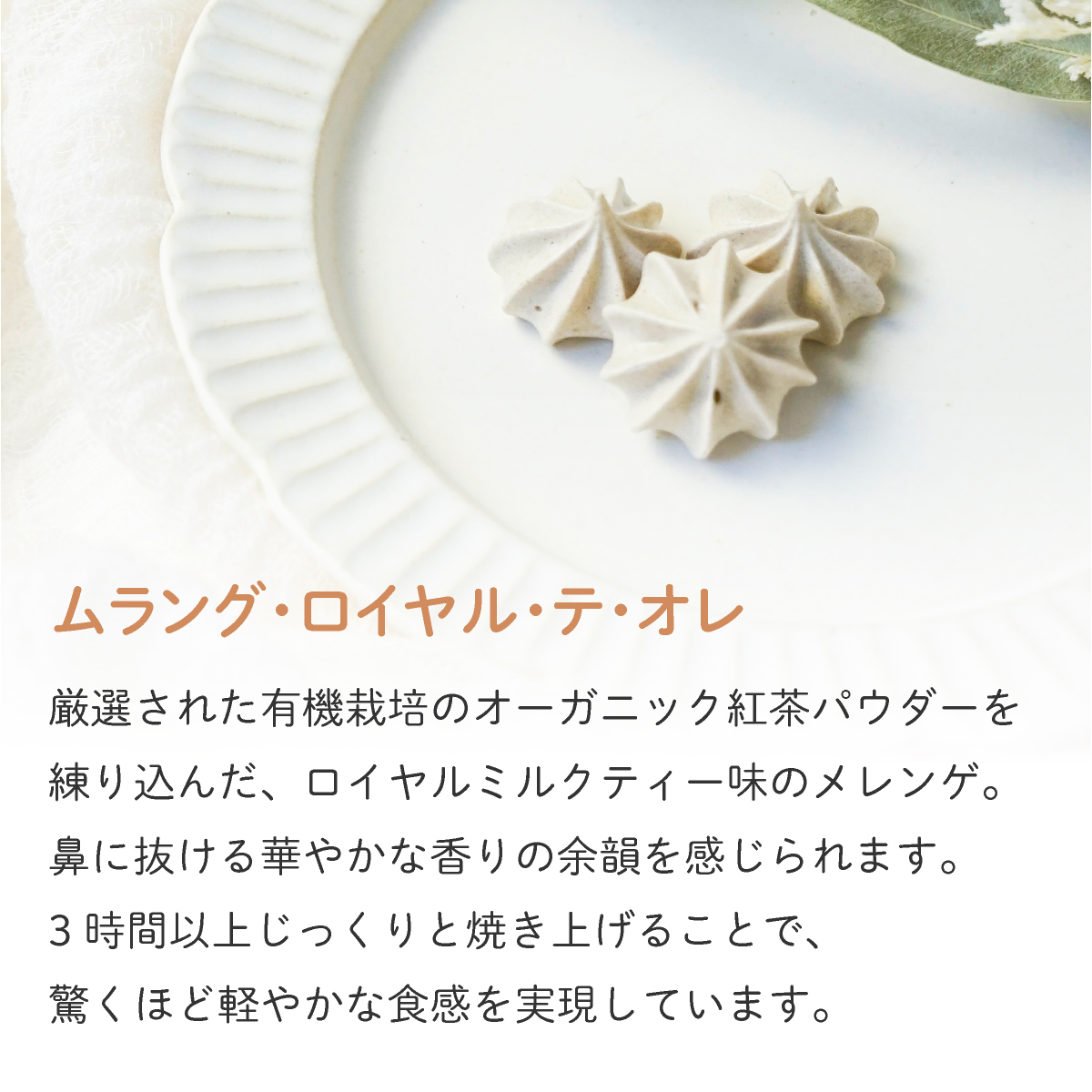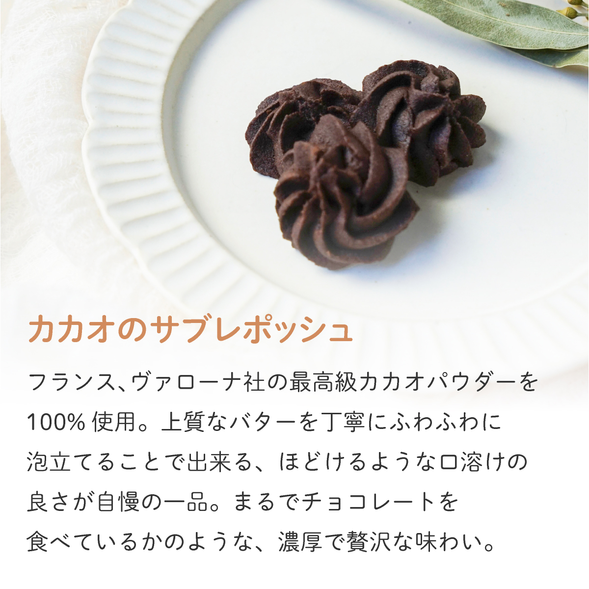 | 内容 | メッセージクッキー(プレーン)10g ココアアーモンドのサブレ 30g カカオのサブレポッシュ 20g ムラング・ロイヤル・テ・オレ 7g |