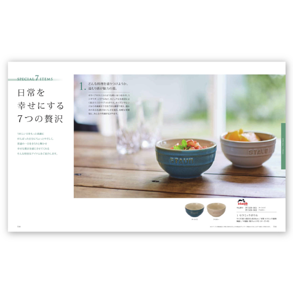 日常を幸せにしてくれる7つのアイテム特集では、特別な商品を厳選してご紹介しています。ストウブのセラミックボウルは軽いおつまみやシリアルなど、カジュアルな食卓にぴったりでえオーブンやレンジでもご活用いただけるので機能性も抜群です。