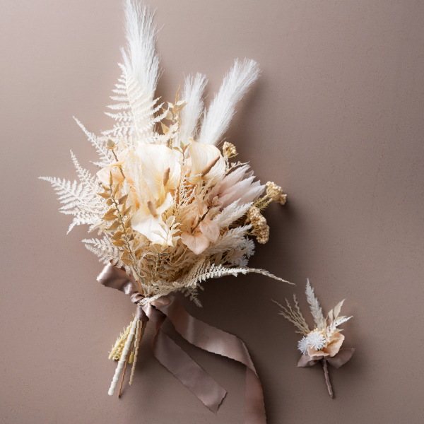 | 内容 | ブーケ×1、ブートニア×1 【主な花材】 アンスリウム、プロテア、ライスフラワー、アスパラファーンなど |