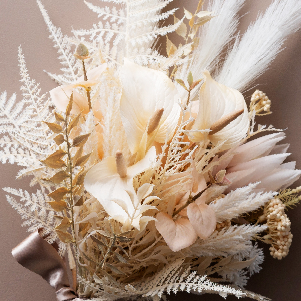アンスリウムやプロテアなどトレンドのお花を取り入れ、優しい雰囲気でまとめたウェディングブーケです。存在感がありながら、ホワイトで統一されているので、ウェディングドレス姿をより上品かつ華やかに引き立ててくれます。