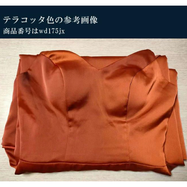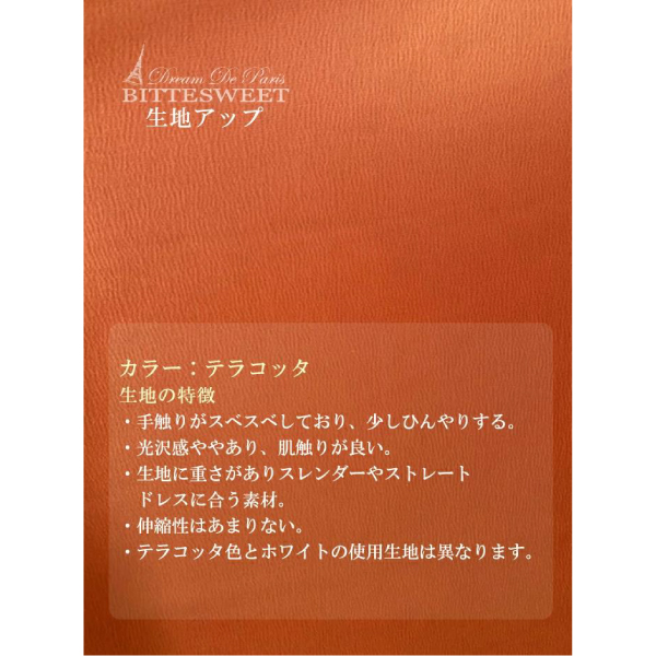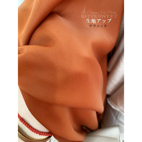 このデザインは、柔らかで優しい印象を与え、身に着ける人の魅力をより鮮やかに際立たせます。また、ネックラインの優雅さが着こなし全体に洗練された雰囲気をもたらし、上品さを演出します。温かみやトレンディな雰囲気、季節感を引き立てる力のあるテラコッタカラーです。