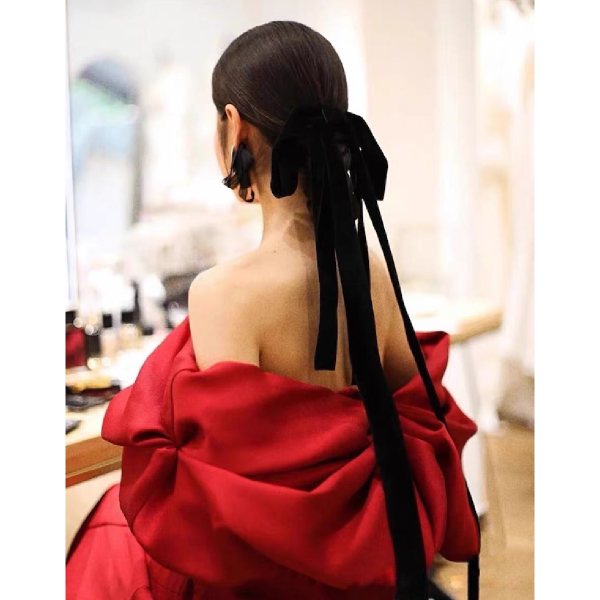 光沢のあるサテンとボリュームのある裾がシルエットを印象づける。パッと目を引く鮮やかなレッドカラーは肌色を美しく引き立て、華やかでモードな雰囲気を作ります。