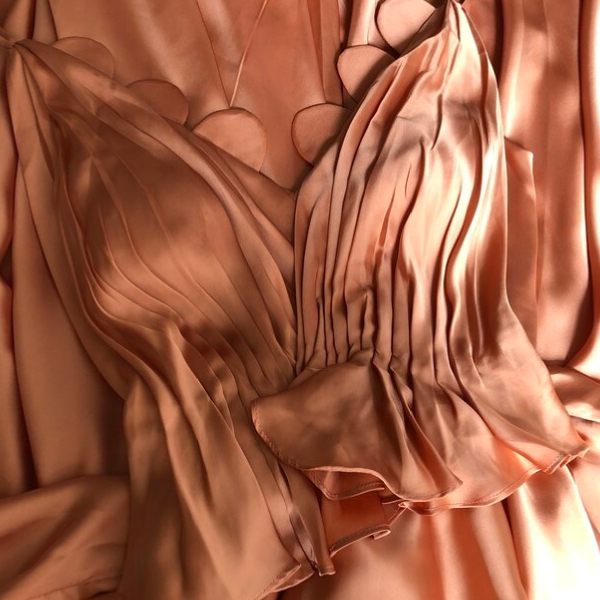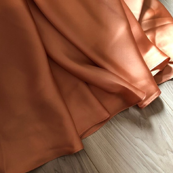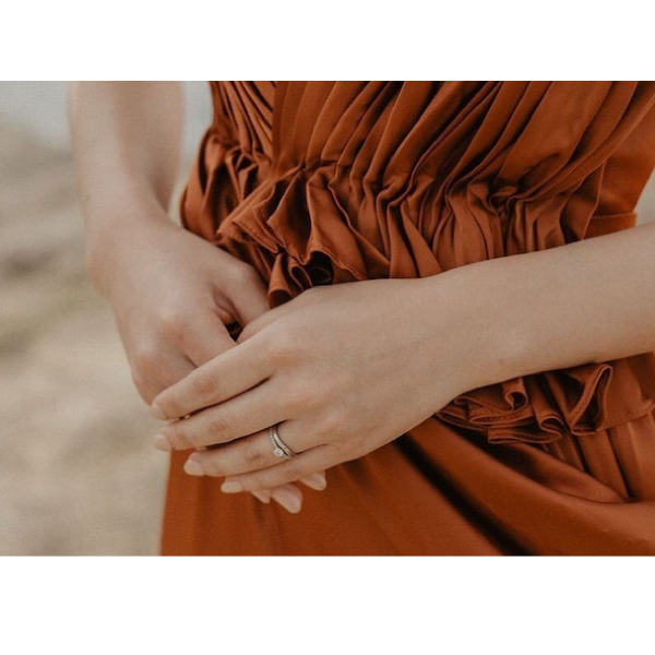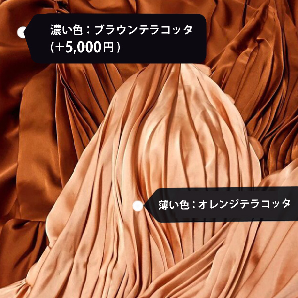 落ち着きと温かみがあるテラコッタカラードレス。胸元のフリルが可愛らしい印象に仕上げてくれます。